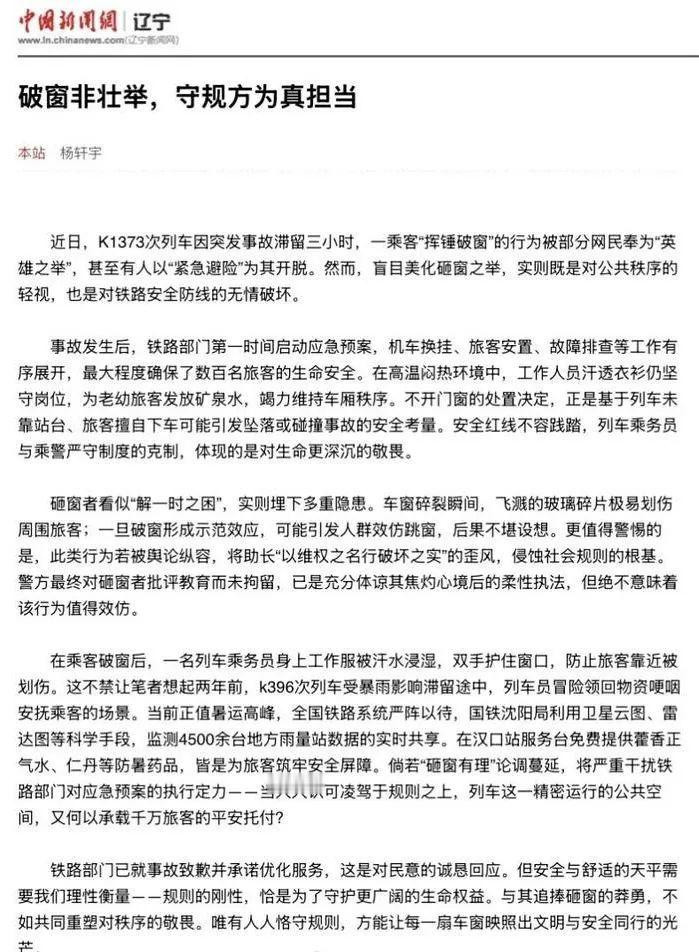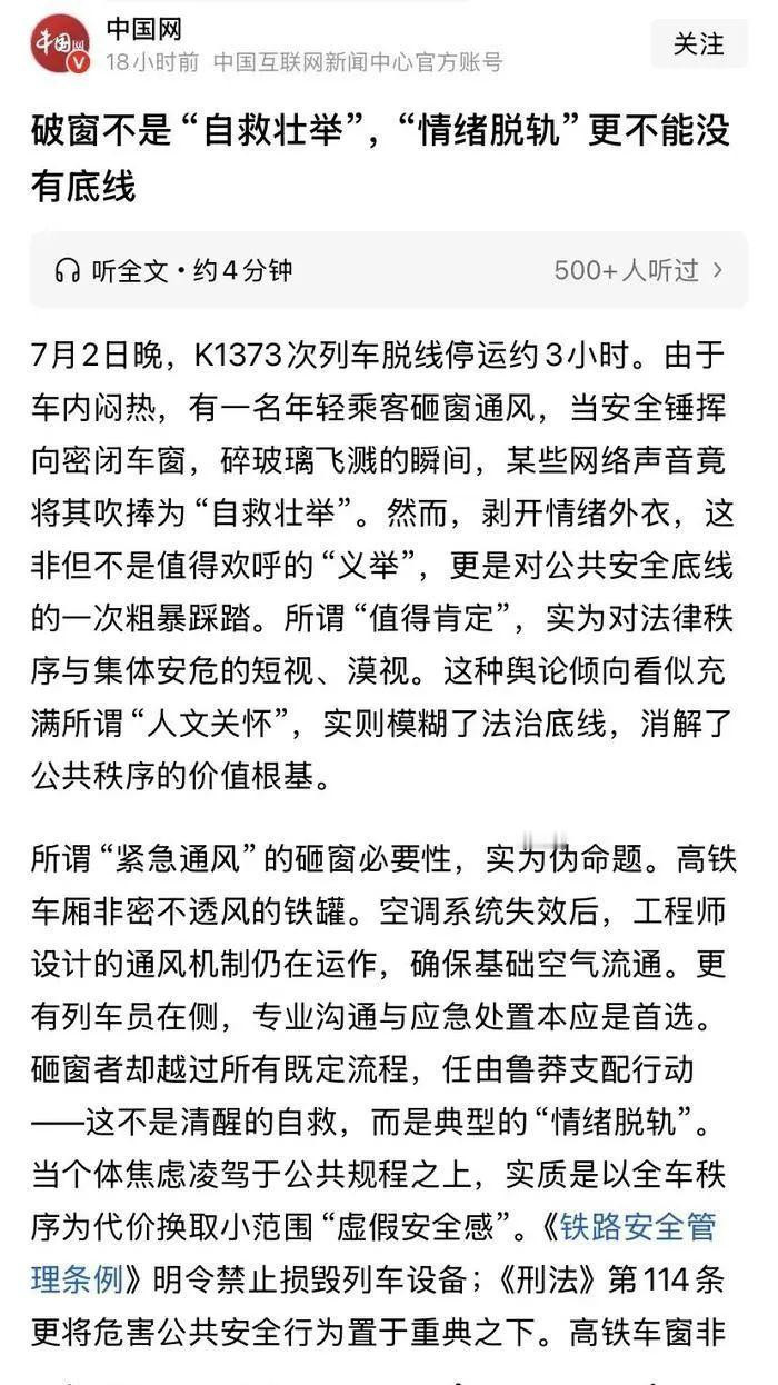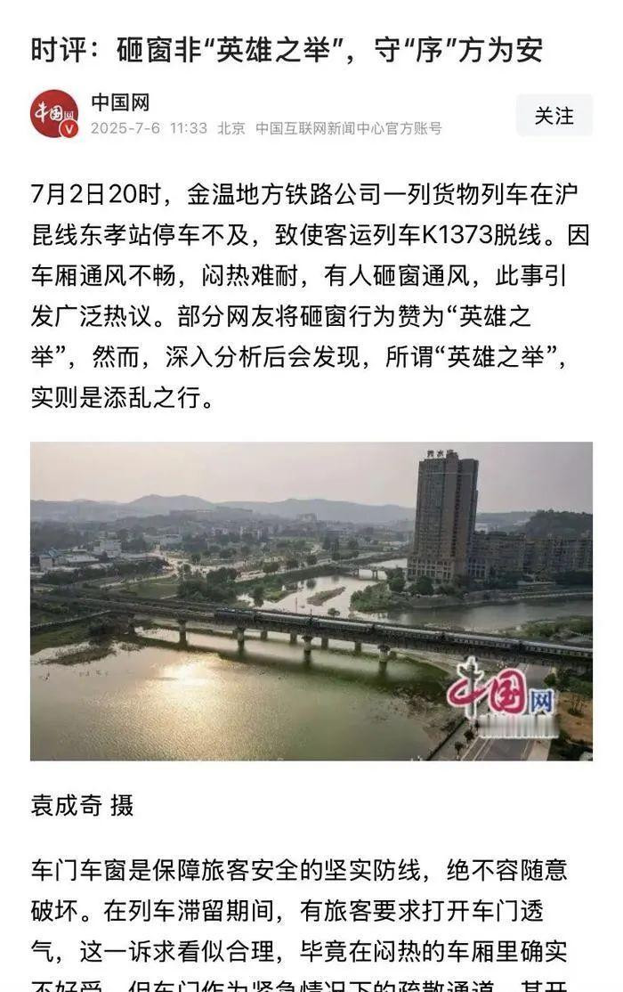 第三,他们说破窗不是壮举,是在添乱,他说了他们认为的安全红线,是列车没有停靠站台,极易发生跌落或者碰撞事故。而对于乘客是不是会中暑,或者诱发其他疾病,这都是排在他们的安全红线之后的。