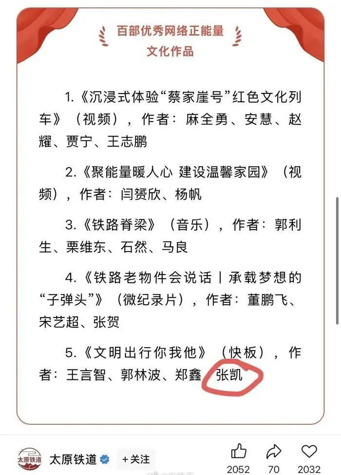 第三篇作者张凯,中铁太原局集团公司宣传部门职工,2024年度铁路正能量网络作品评选获奖者。